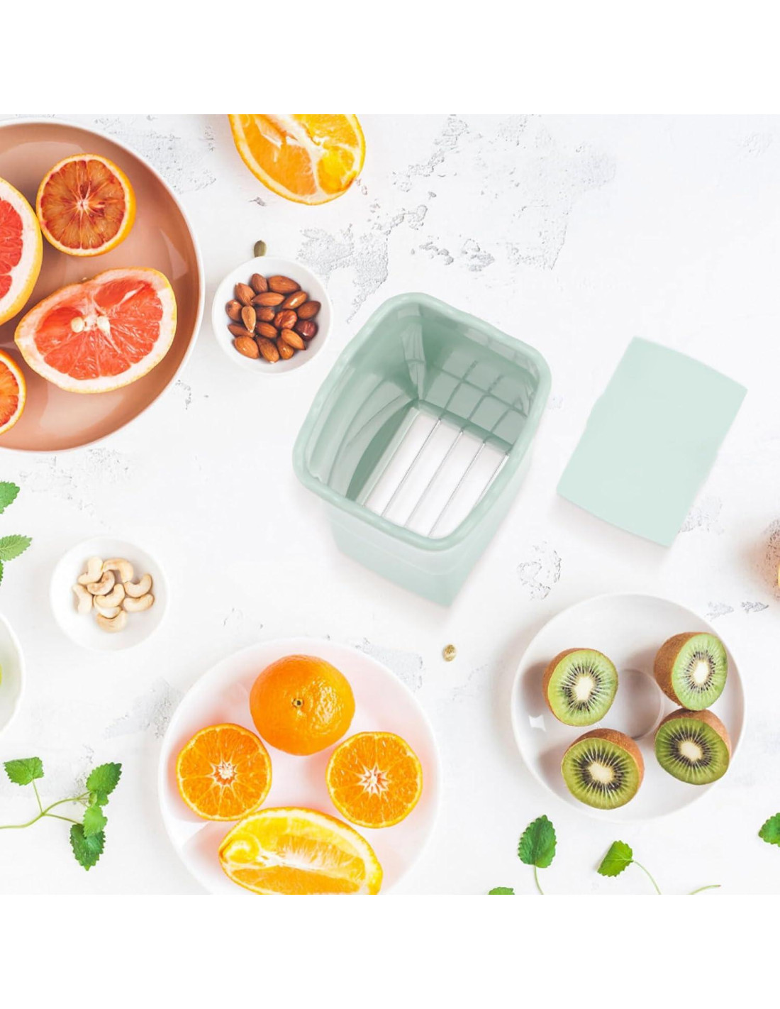 - HERRAMIENTA DE COCINA MULTIFUNCIONAL: No solo para frutas, este cortador también se puede usar para cortar huevos hervidos, champiñones y otros. Su versatilidad lo convierte en una valiosa adición a cualquier cocina, ayudándote a preparar ensaladas, postres y más con facilidad. El color verde nórdico añade un toque de elegancia a la decoración de tu cocina