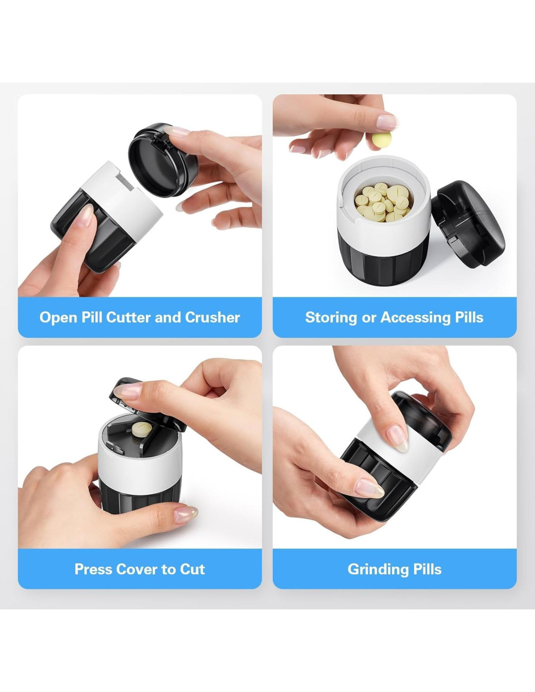 - Fácil de Usar - Abre el almacenamiento de pastillas, saca tu medicación y usa el cortador de pastillas para un corte preciso. Las pastillas cortadas se pueden triturar en polvo fino con el molinillo de pastillas según tus necesidades
