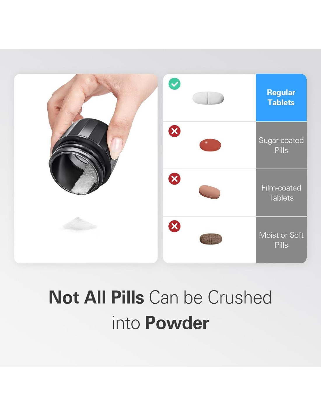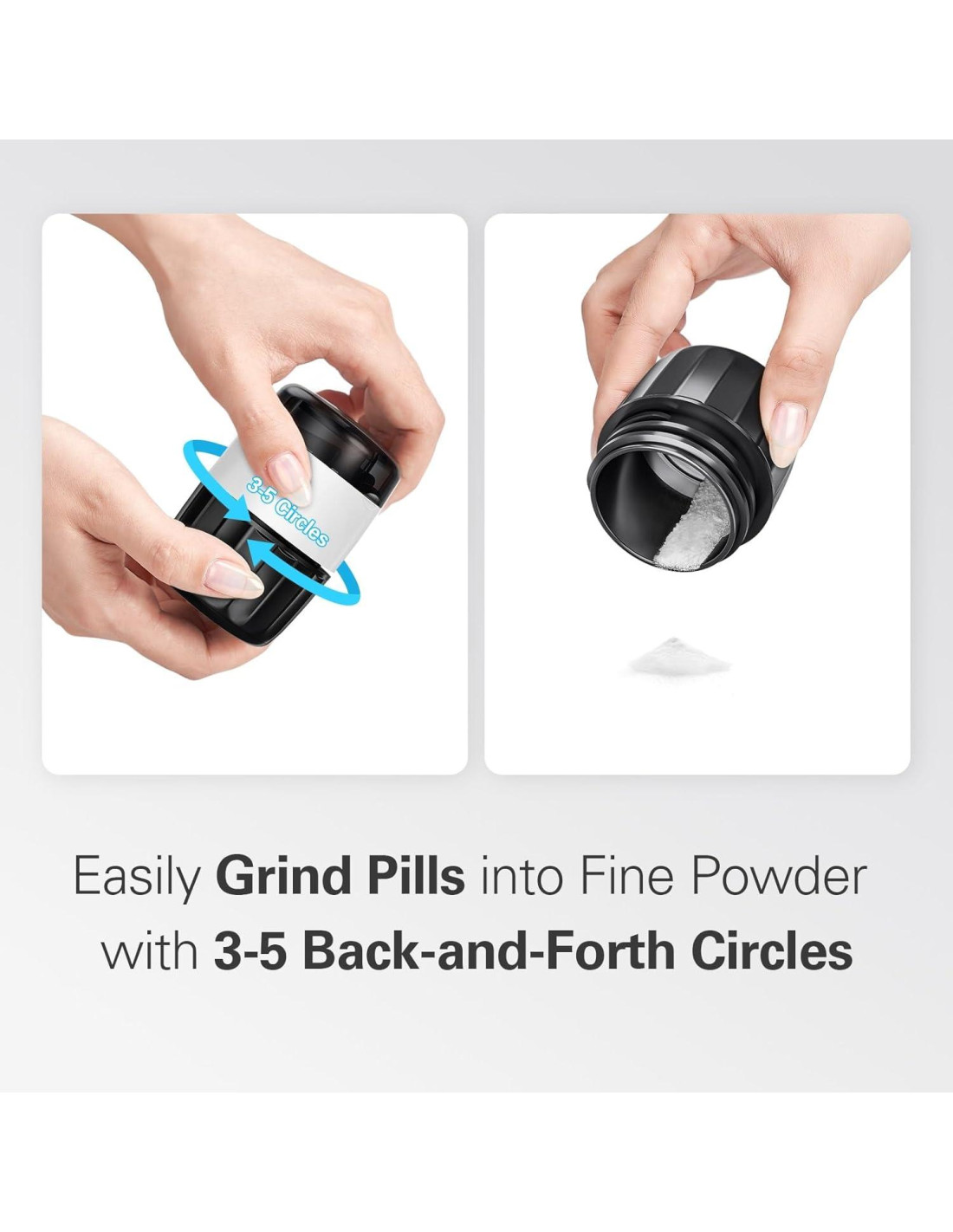 - Fácil de Triturar - Nuestro triturador de pastillas en polvo fino solo necesita rotar hacia adelante y hacia atrás de tres a cinco veces para triturar las pastillas en polvo fino para una mejor deglución. El mortero y la mano del molinillo de pastillas están unidos con una capa de acero inoxidable, previniendo efectivamente que partículas de plástico se mezclen en el polvo, asegurando un uso seguro