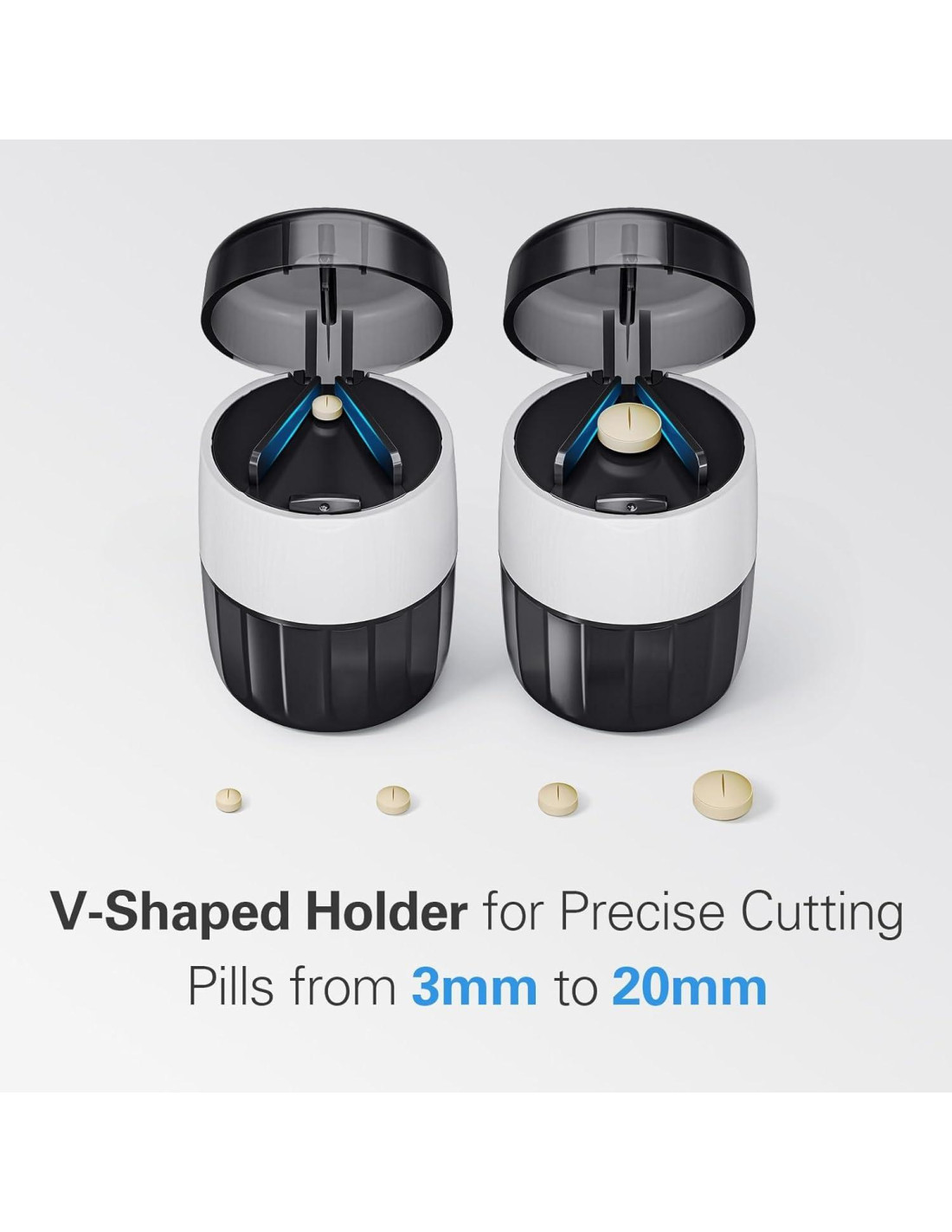 - Corte Preciso con Diseño en V - Nuestro cortador de pastillas para pastillas pequeñas y minúsculas cuenta con un ingenioso diseño en V para sujetar las pastillas de manera segura, asegurando cortes precisos para pastillas que van de 3mm a 20mm