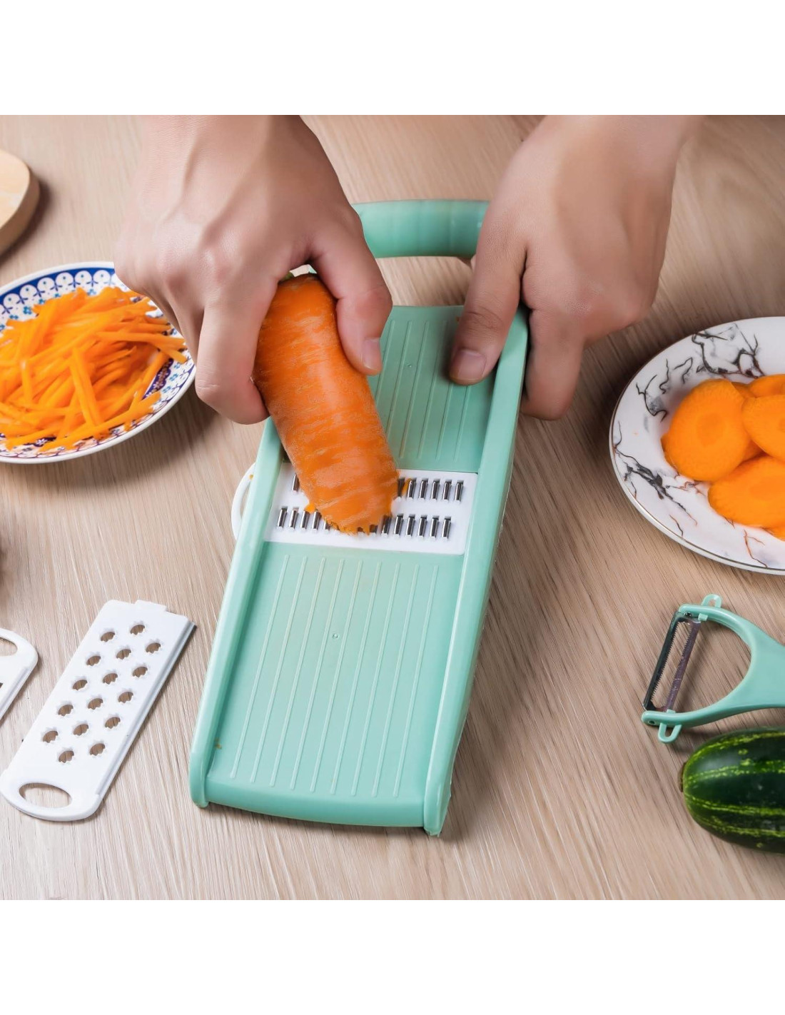 - [MULTI CUCHILLA AJUSTABLE] - El paquete de la mandolina para cocina incluye cinco cuchillas ajustables para rallar, cortar, desmenuzar, picar y moler. También viene con un pelador para pelar fácilmente. Perfecto para ensaladas de verduras, papas fritas, papas fritas en waffle, pelado.