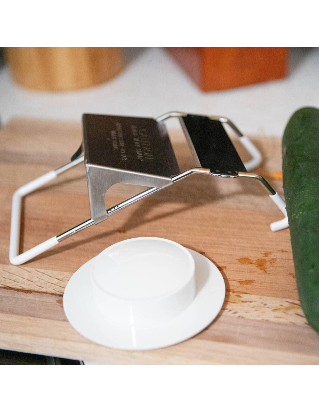 Disfruta de un Corte Sin Esfuerzo. Corta a través de la preparación de tus comidas con el Cortador de Verduras Famoso de Feemster. Este cortador estilo mandolina está calibrado para hacer cortes perfectamente uniformes de 3.2 mm a 12.7 mm de grosor, así que tu salteado se cocina de manera uniforme y tus ensaladas lucen geniales. El Cortador de Verduras Famoso de Feemster es excelente para papas, cebollas, pepinos, tomates, repollo y una variedad de verduras y frutas. El soporte de seguridad incluido ayuda a mantener tus dedos a salvo de la cuchilla mientras cortas tus alimentos favoritos. Los pies antideslizantes aseguran estabilidad y facilidad de uso mientras cortas. Su tamaño compacto ahorra espacio en tu cocina. Ideal para deshidratar, verduras de raíz en rodajas, papas fritas, etc. Cuchilla de acero al carbono súper afilada. Montado en un conveniente marco de acero y aluminio. Solo lavar a mano. Dimensiones totales: 216 mm de largo x 102 mm de ancho x 76 mm de alto. Cuchilla: 89 mm de ancho. Soporte de Seguridad: 114 mm de diámetro exterior.