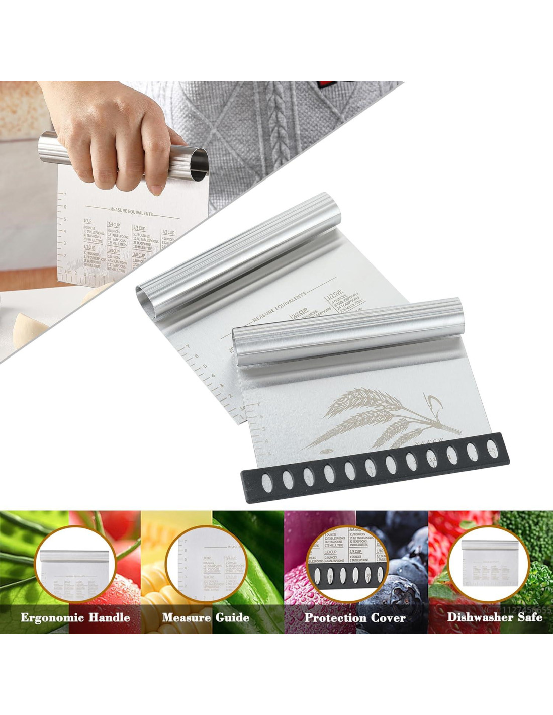 - 2. Escala de Medición de Precisión: Uno de los raspadores de masa en el set cuenta con una escala de medición grabada con láser resistente al desgaste. Esta escala precisa te permite medir ingredientes con exactitud, eliminando la conjetura en las recetas. Desde el grosor de la masa hasta las cantidades de ingredientes, logra consistencia en tus creaciones culinarias.