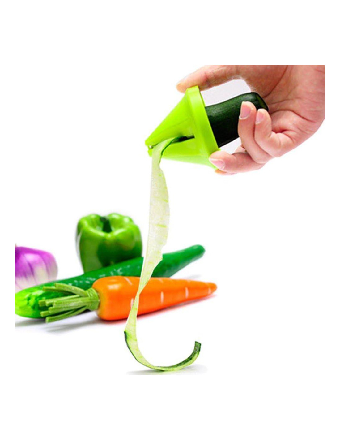 Descripción: Nuevo y de alta calidad. Con el Cortador Espiral puedes conjurar tiras de juliana interminables de zanahoria, rábano, pepino y todo tipo de otras verduras firmes. Las espirales son perfectas para crear salteados de verduras o platos de pasta. Genial para guarniciones, emplatado y decoración de platos de servicio. Está construido de plástico de alta calidad y acero inoxidable. Fácil de limpiar bajo agua corriente. Material: plástico y acero inoxidable. Color: verde Tamaño: 6.5 cm x 5.5 cm (2.5 pulgadas x 2.15 pulgadas)