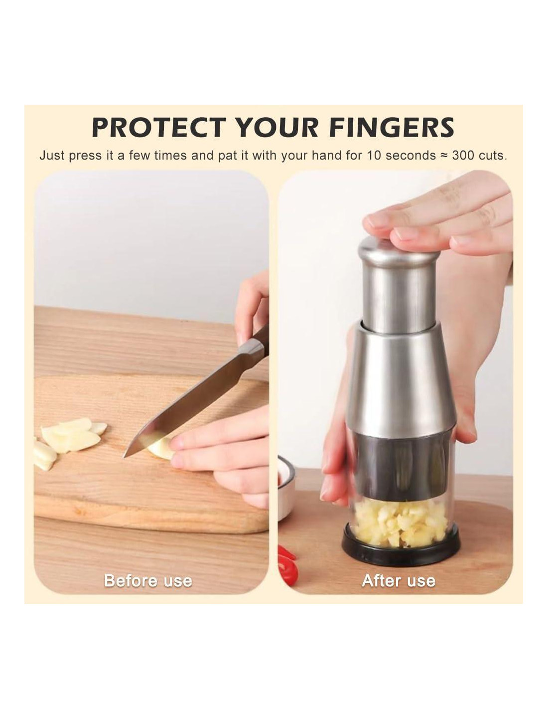 - [CUCHILLAS DE ACERO INOXIDABLE] ¡Pica fácilmente una variedad de verduras, frutas e ingredientes con el picador de mano! Di adiós a las tediosas tareas de picar y cortar. Cuchilla de acero inoxidable, no se oxida fácilmente, cuchilla afilada y duradera, presiona fácilmente los ingredientes.