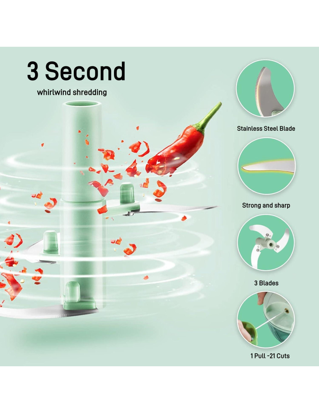 - Ahorra tiempo El tamaño y grosor de los alimentos dependen de cuántas veces tires de la cuerda. Tirar de la cuerda una vez equivale a cortar con un cuchillo al menos 10 veces. 1 a 5 veces resulta en alimentos gruesos, 6 a 10 veces da una textura media, 11 a 20 veces resulta en una textura fina, y más de 20 veces da una consistencia similar a un puré líquido. Depende de ti controlar.