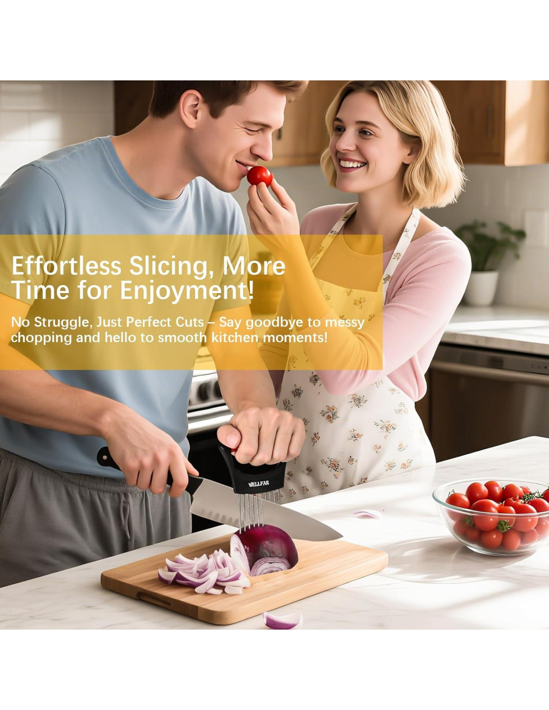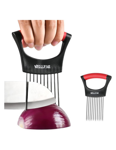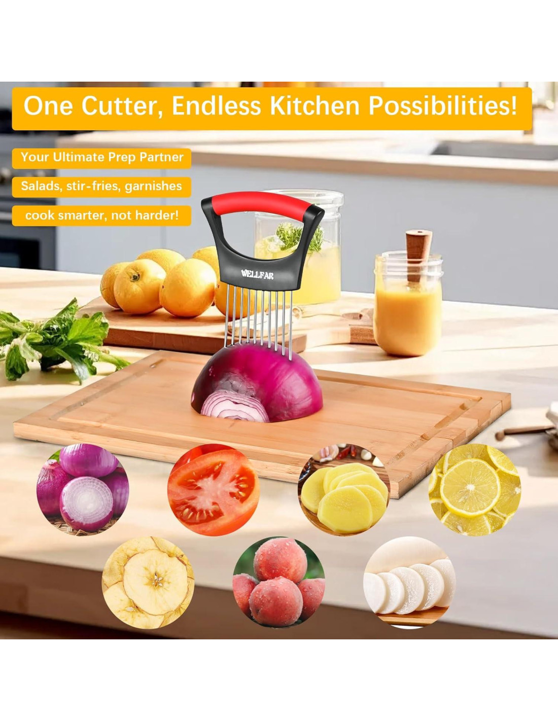 - Diseño Inteligente y Eficiente Nuestro soporte para cortar cebolla (2-Pack) presenta el mismo tamaño práctico para un rendimiento de corte consistente. Las agujas afiladas de acero inoxidable sostienen de manera segura cebollas, tomates, papas y otras verduras en su lugar, evitando deslizamientos para cortes perfectamente uniformes. Las juntas de pin robustas aseguran una durabilidad prolongada, convirtiéndolo en un gadget de cocina imprescindible para una preparación de alimentos sin esfuerzo.
