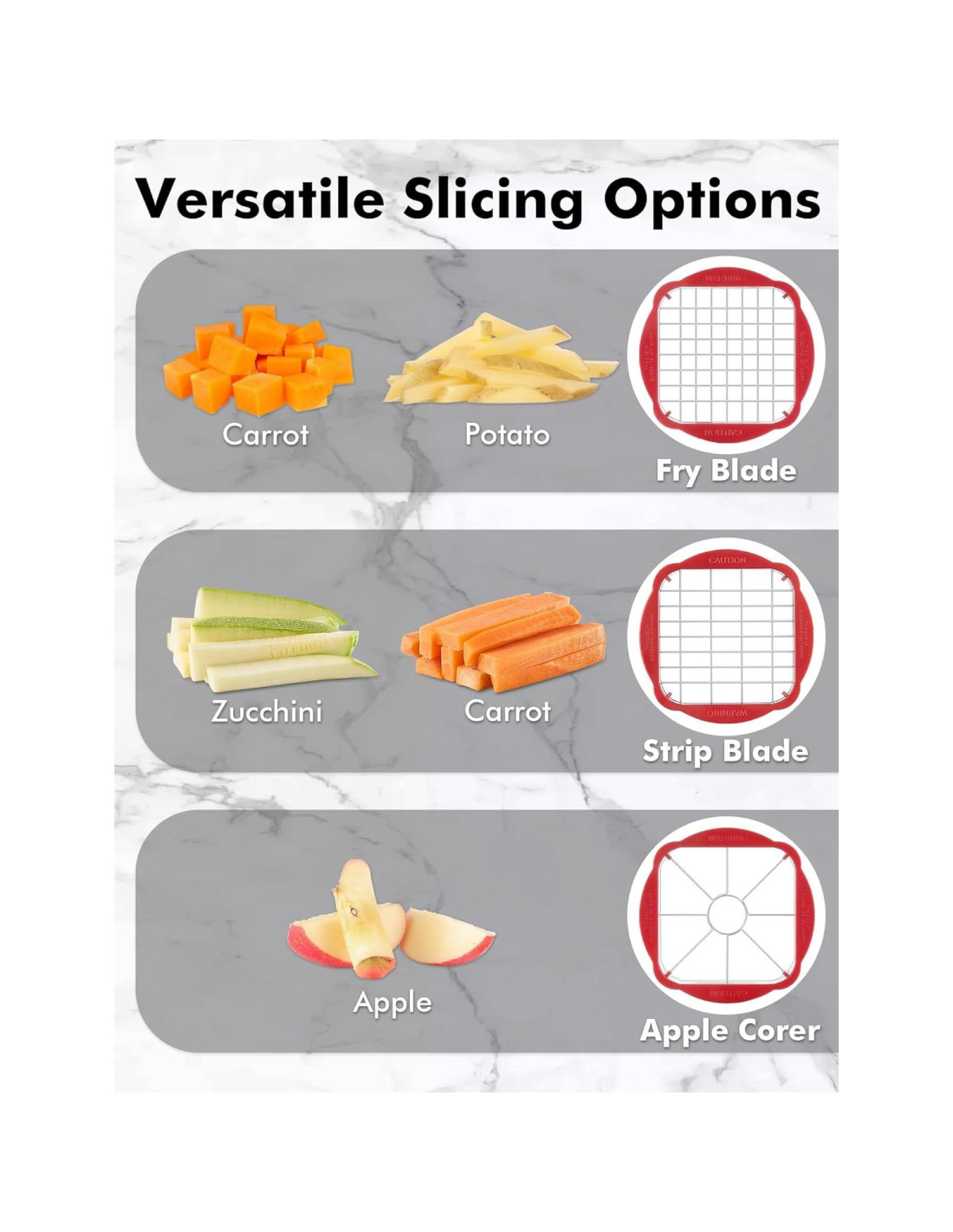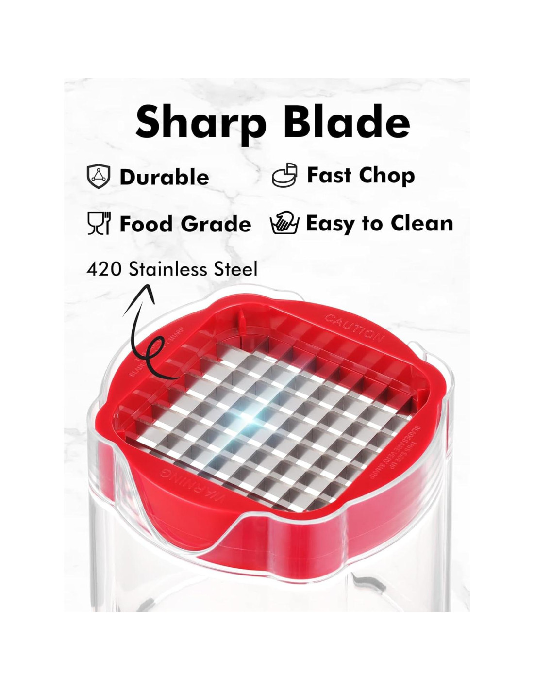 - Corte en Un Segundo: Simplemente presiona hacia abajo con ambas manos y obtén papas fritas, verduras o frutas perfectamente rebanadas en segundos. Ya sea que estés preparando un desayuno rápido, haciendo bocadillos saludables para los niños, o preparándote para una barbacoa de fin de semana, este cortador de papas fritas reduce el tiempo de preparación a la mitad, ¡sin más trabajo desordenado con cuchillos!