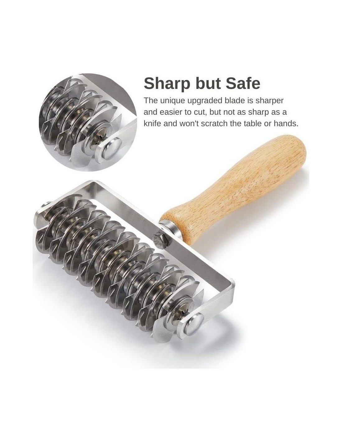 - Diseño Mejorado - Muchos productos similares tienen cuchillas que no son lo suficientemente afiladas para cortar completamente la masa. Nuestro cortador de masa en rejilla ha sido mejorado para hacer la parte inferior de la cuchilla redonda más delgada y afilada para cortar fácilmente sin necesidad de volver a mecanizar. Pero nada tan afilado como un cuchillo de cocina, garantizado que es seguro y no dañará su superficie de trabajo.
