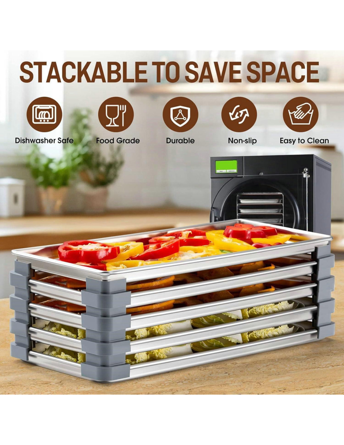 - Mantén la cocina limpia y sin desorden Los apiladores de bandejas para bandejas de deshidratador Harvest Right pueden hacer que tus bandejas se apilen en orden. Evita que la comida se deslice, mantiene tu encimera despejada y sin desorden
