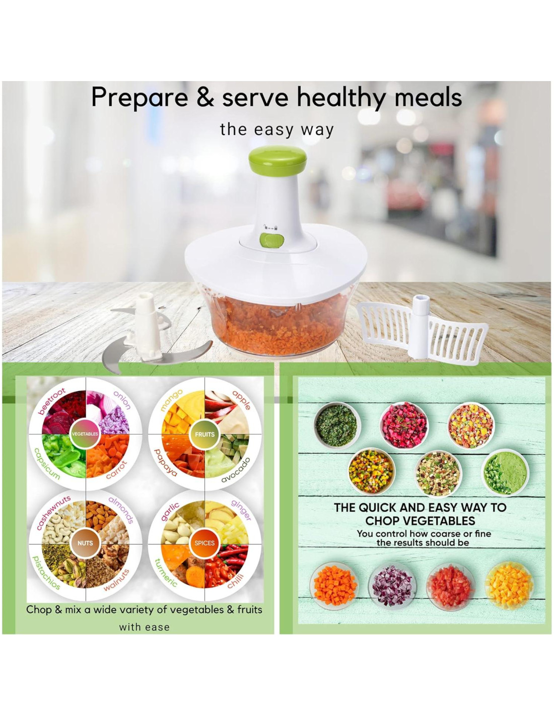 - Un regalo perfecto para todas las ocasiones: ¿Qué más puede ser un mejor regalo para tus seres queridos que este regalo de salud? Úsalo como picador de cebolla, picador de ajo, fabricante de salsa, picador de ensalada de col, prensa de coliflor, picador indio, procesador de alimentos manual. Hace que comer verduras sea divertido y atractivo para todos.