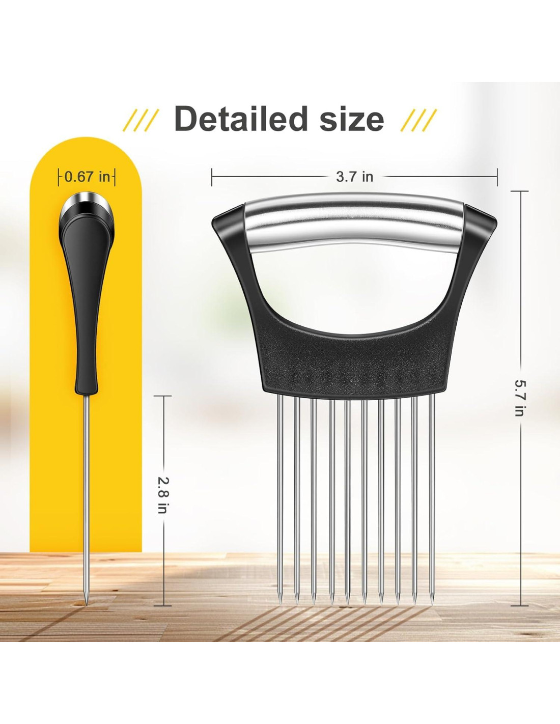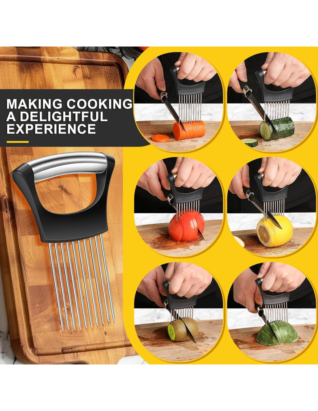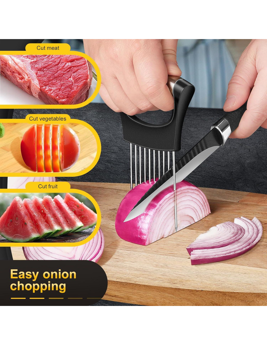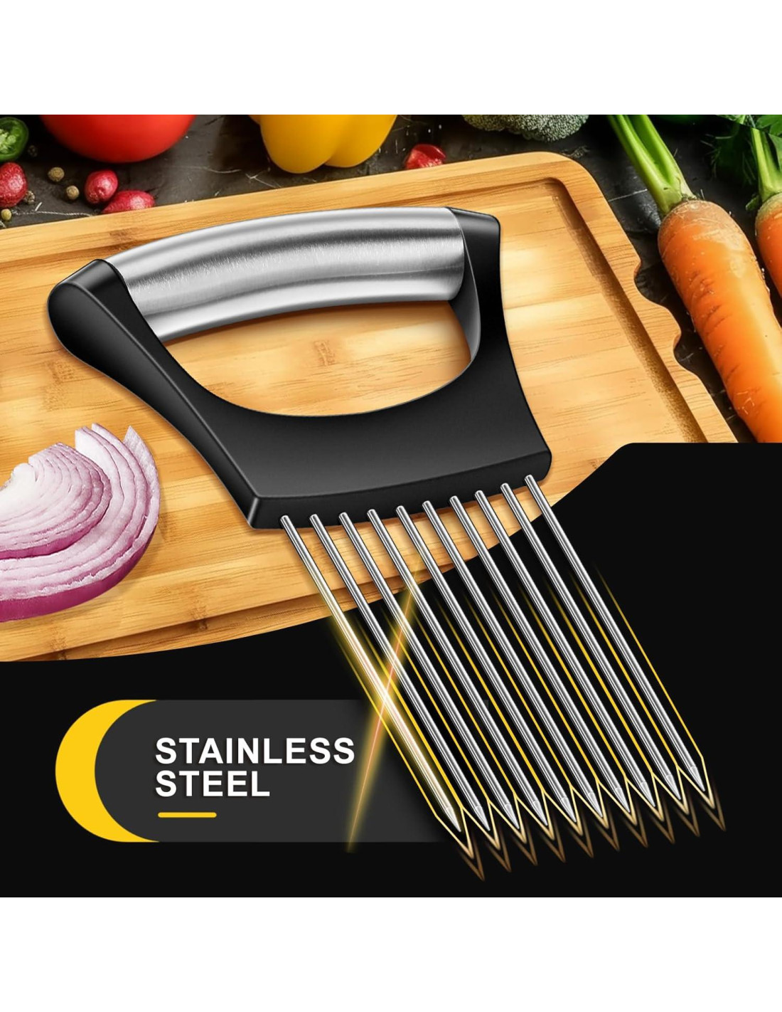 Nuestro Cortador de Cebolla, un compañero de cocina versátil diseñado para simplificar y agilizar tus tareas de preparación de alimentos. Este cortador distintivo está equipado con tenedores de acero inoxidable debajo del mango. Estos tenedores ofrecen un mango firme y confiable, eliminando efectivamente cualquier riesgo de deslizamiento durante su uso. Gracias a su diseño multifacético, permite un corte preciso de cebollas, tomates, limones y carnes por igual. Sin duda, se ha convertido en una adición indispensable a cada cocina.