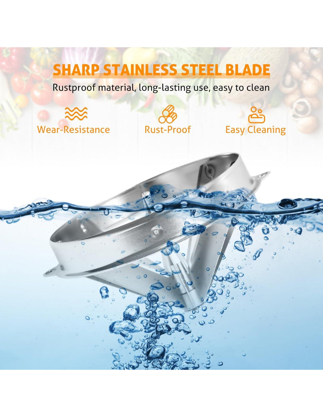- Cuchilla de Acero Inoxidable - Hecha de acero inoxidable de alta calidad, fácil de limpiar, diseño amigable para el usuario. NOTA: Se recomienda no cortar batata. La batata es dura, causará un gran daño a la cuchilla.