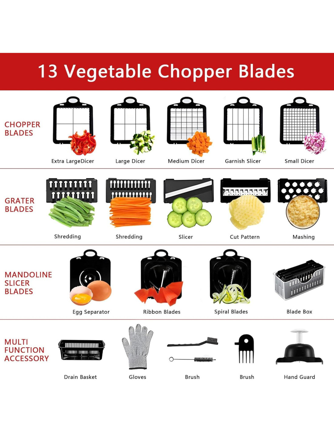 - 13 cuchillas intercambiables extra afiladas. Viene con 13 cuchillas de acero inoxidable, incluye 5 cuchillas para picar, 5 cuchillas para rebanar para rebanar, rallar y juliana, 2 cuchillas en espiral y 1 separador de huevos extra. Las cuchillas afiladas están hechas de acero inoxidable de grado alimenticio 420 que no se oxida ni se dobla, lo que puede ayudarte más fácil y rápidamente a obtener el tamaño y la forma perfectos.