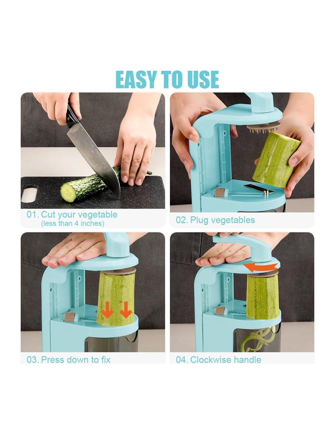 - 4 EN 1 CUCHILLA ROTATIVA - Se pueden seleccionar diferentes cuchillas girando el rodillo para hacer verduras de diferentes formas. El diseño vertical puede aprovechar mejor el papel de la gravedad, ayudándote a ahorrar más tiempo y esfuerzo durante la preparación de la cocina. Solo necesitas cortar las verduras en longitudes adecuadas (menos de 10.16 cm), luego puedes comenzar a disfrutar de la diversión de cortar verduras.
