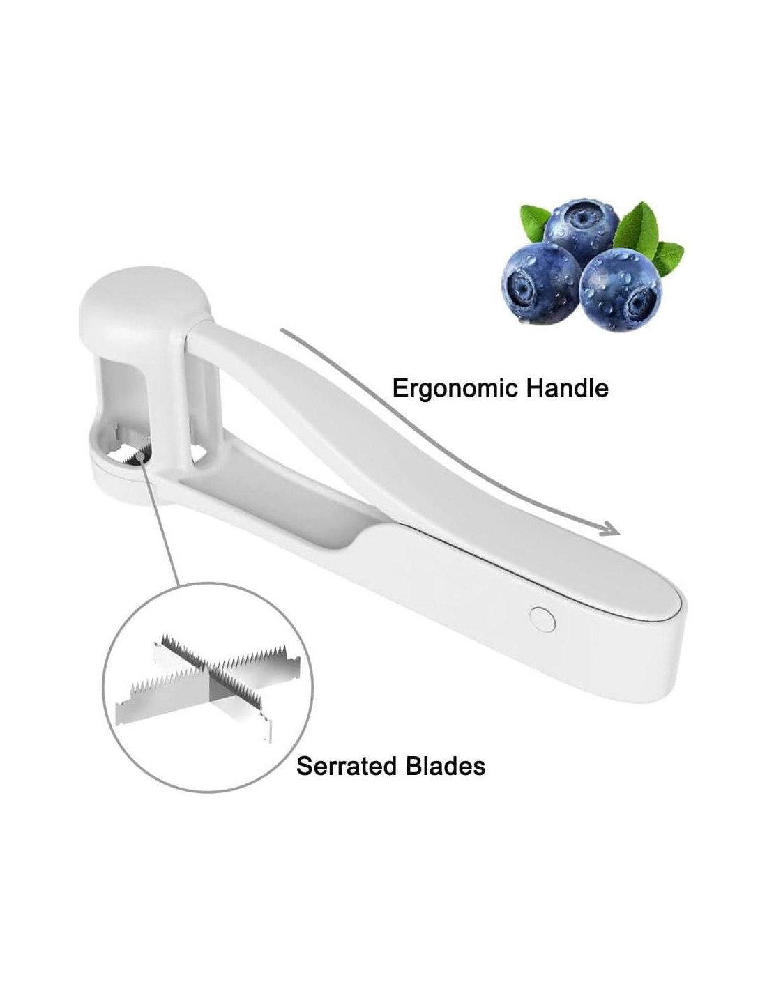 - Corte Preciso El cortador de uvas está diseñado con cuchillas afiladas, el diseño semi-cerrado envuelve la fruta para evitar que ruede, haciendo que el proceso de corte sea más fácil y rápido. Con solo una mano y una simple presión del pulgar, la fruta se puede cortar sin esfuerzo en cuatro pequeñas piezas