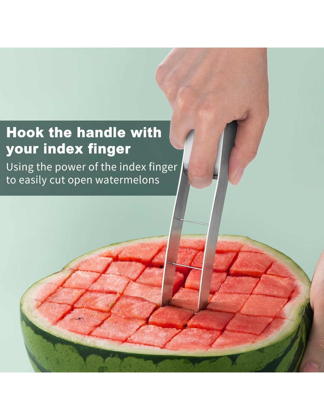 - [Corta la sandía en cubos] Este cortador de sandía está especialmente diseñado para cortar sandía. Corta la sandía verticalmente primero, luego corta la sandía en sentido transversal. Rápidamente cortaremos en cubos las rebanadas de sandía para que tú y tu familia y amigos disfruten de la jugosa sandía rebanada.