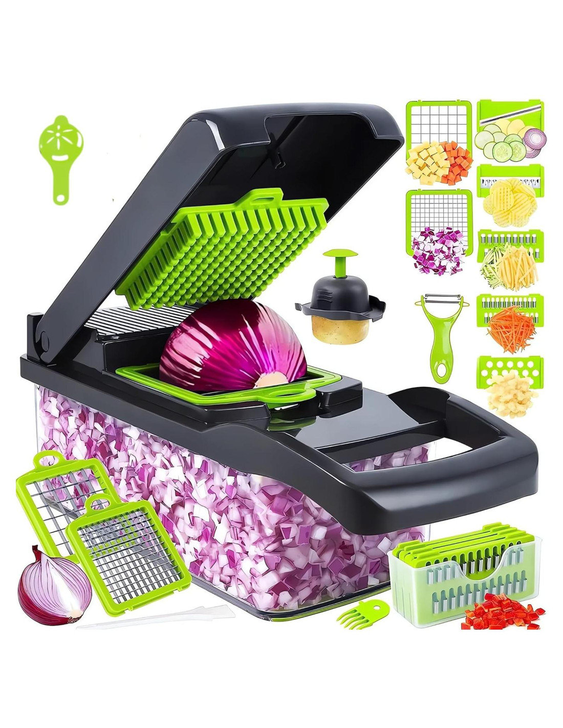 - [HERRAMIENTA DE COCINA TODO EN UNO PARA UNA PREPARACIÓN FÁCIL] Esta poderosa herramienta combina un cortador de verduras, rebanador mandolina, picador de ajo, rallador de queso y procesador de alimentos en un solo dispositivo. Pica, rebanar, ralla y espiraliza tus ingredientes - ideal para ensaladas, salteados, tazones de frutas y más.