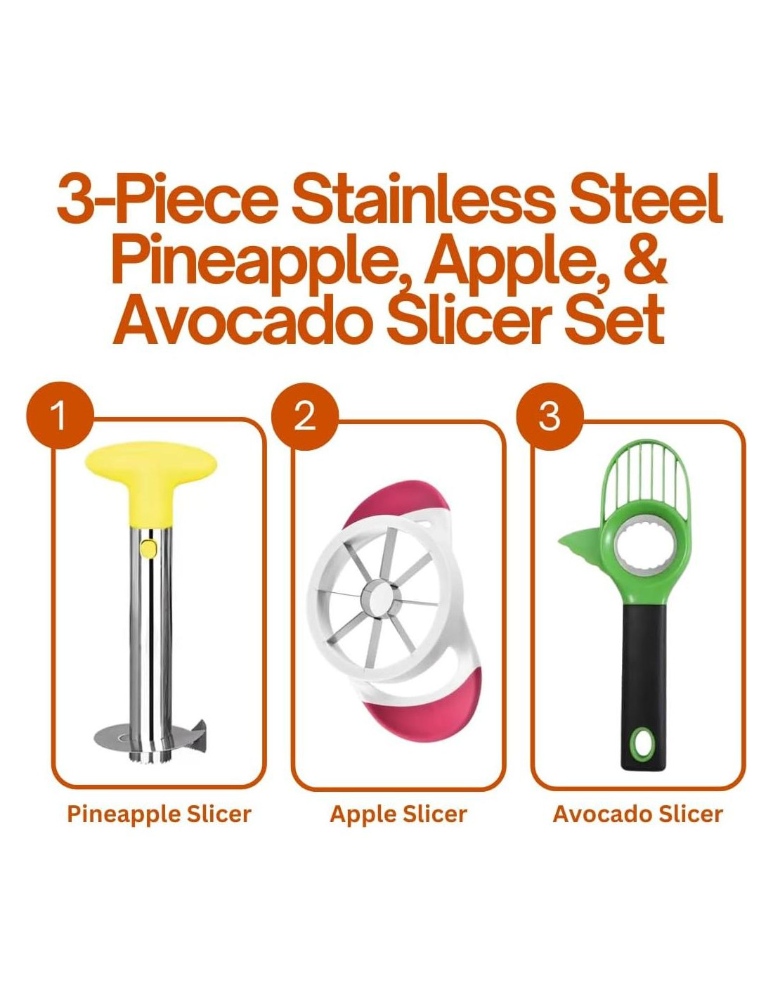 - Juego de Cortadores y Corers de Frutas 3-en-1 - Prepara sin esfuerzo tus frutas favoritas con este juego de cortadores de alta resistencia, que incluye un cortador de manzana, herramienta de aguacate y corer de piña. Diseñado para una preparación rápida y sin desorden, ¡es perfecto para cocinas ocupadas y amantes de las frutas!