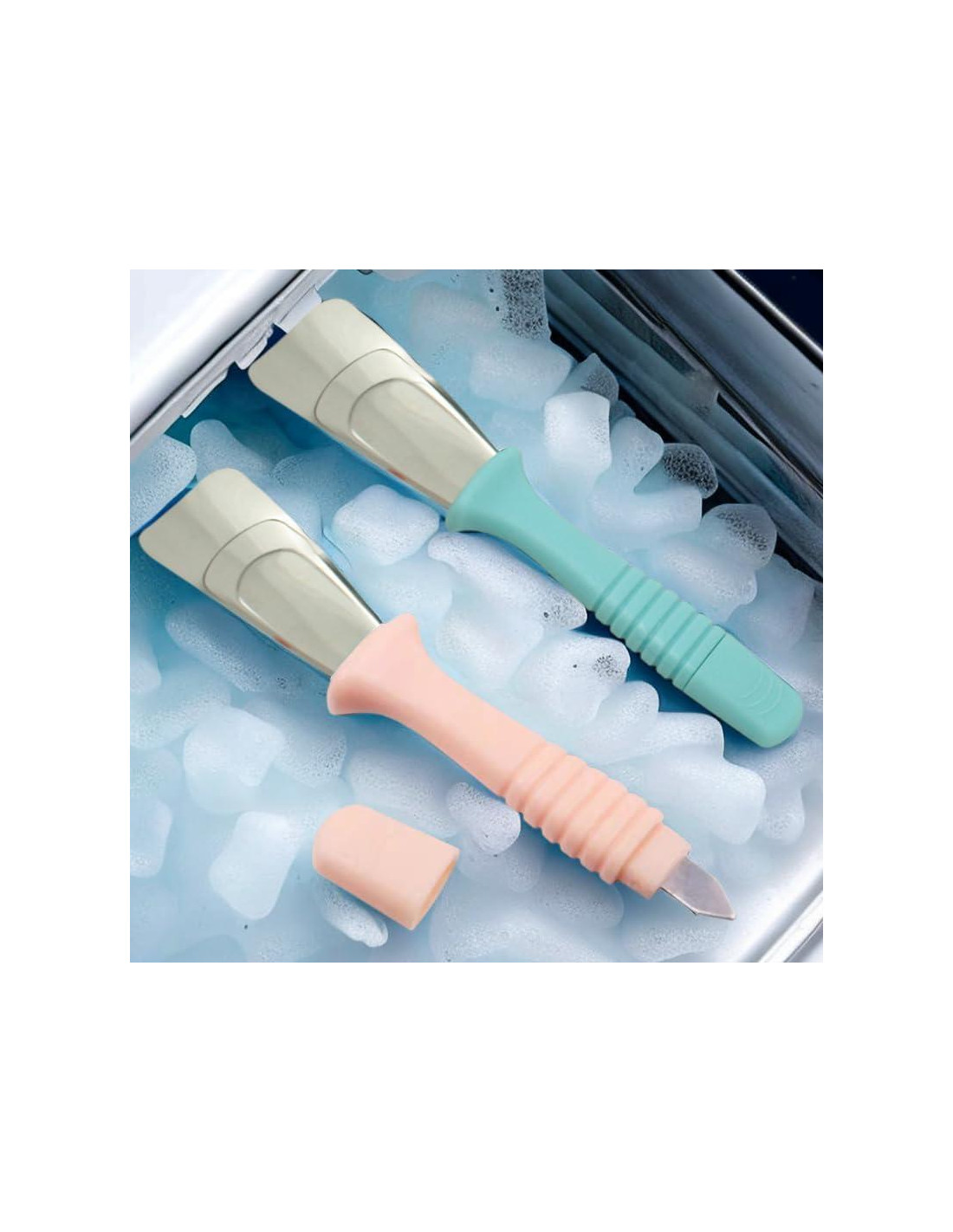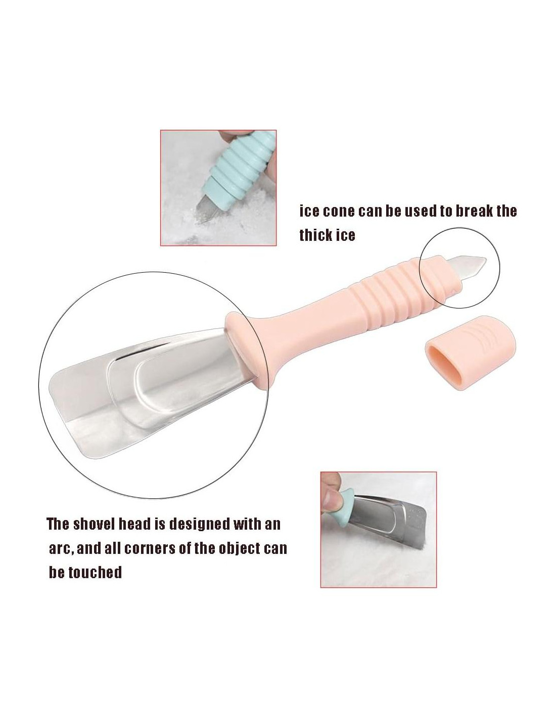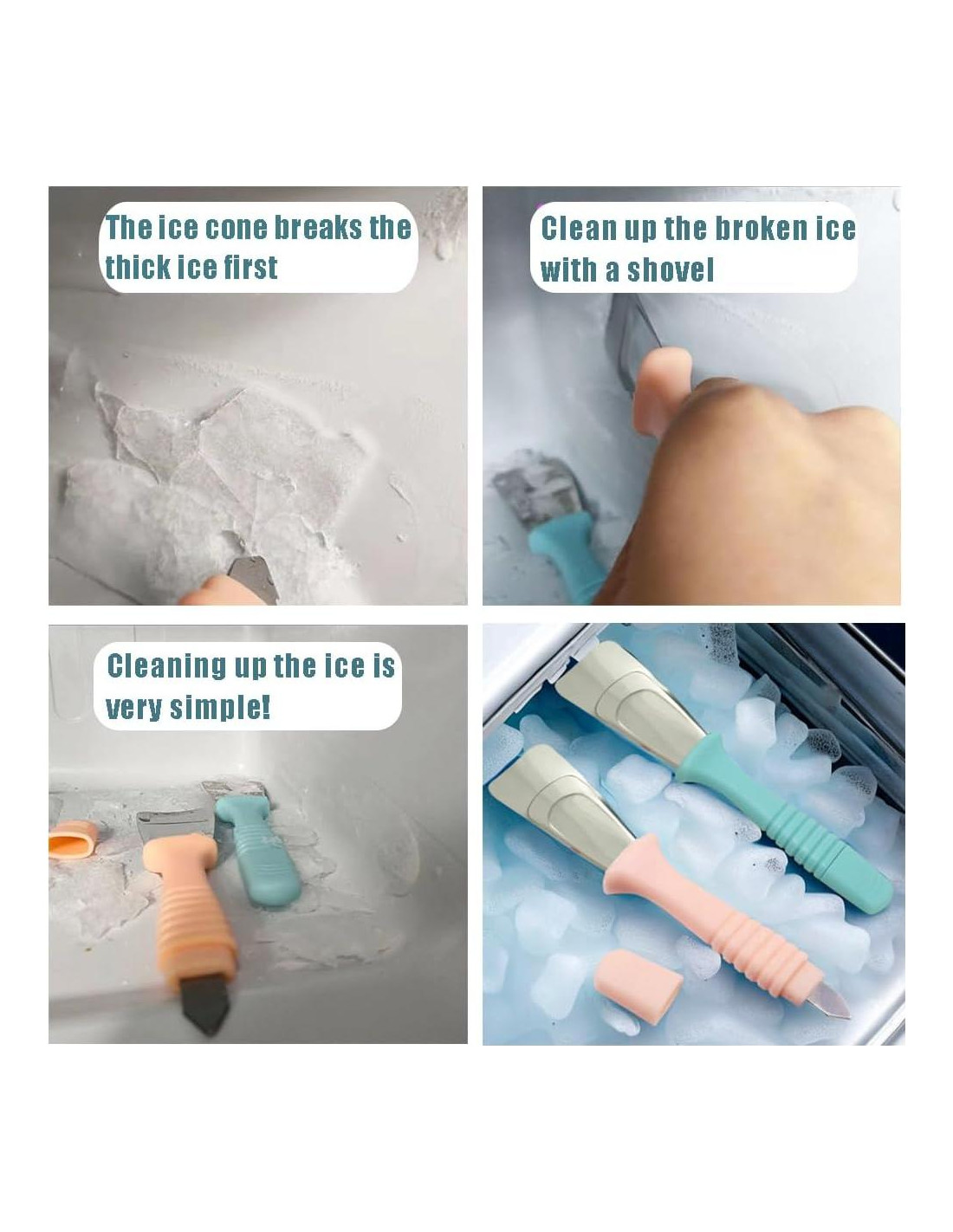 - Diseño de Doble Cabeza: La pala de refrigerador es de doble cabeza, la pala de escarcha se puede usar para eliminar la escarcha del refrigerador, y el cono de hielo se puede usar para romper el hielo grueso.