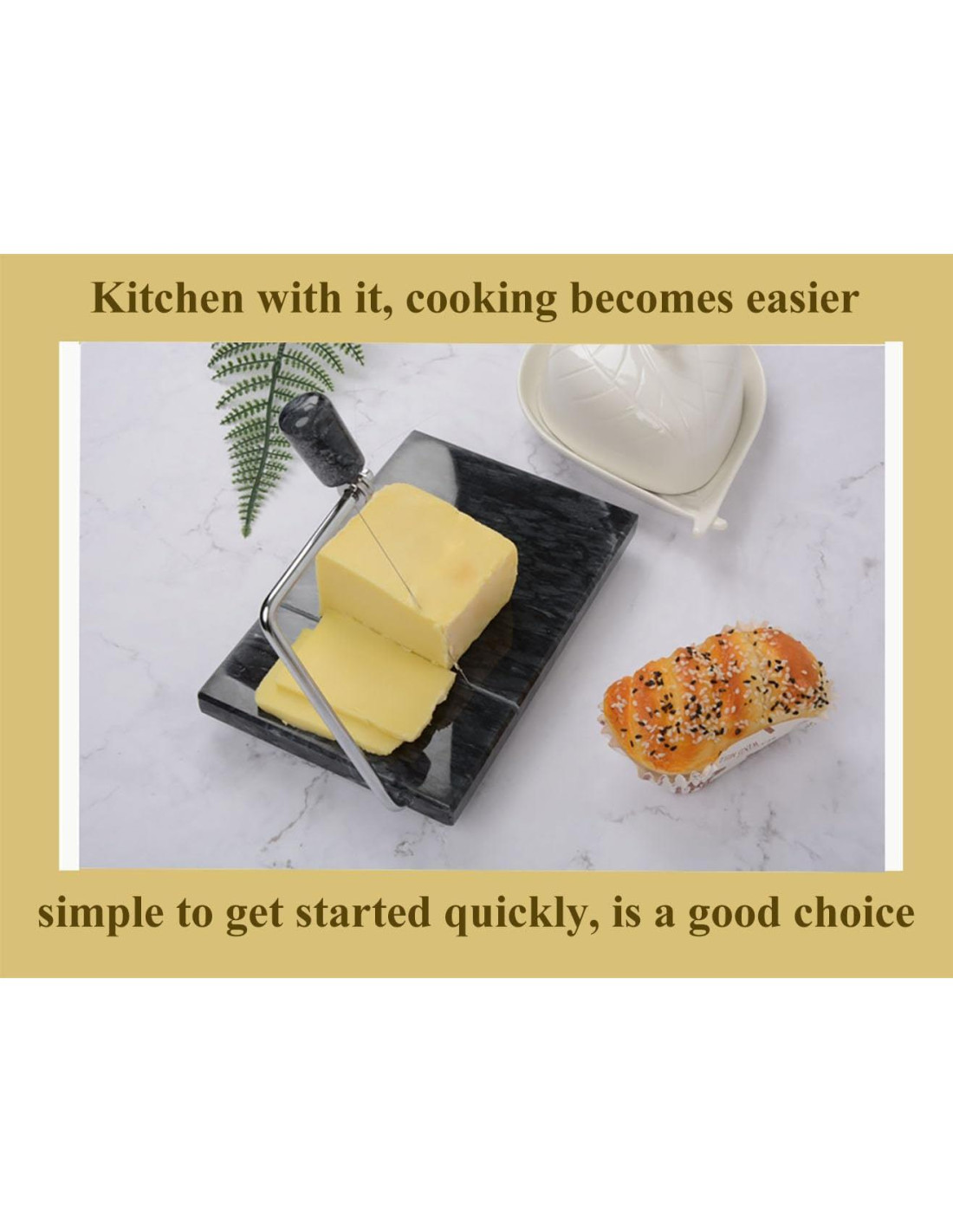 - División Fácil: El cortador de queso está hecho de mármol de alta calidad, nuevamente con una superficie de trabajo pulida que tiene características antiadherentes. El alambre de acero puede pasar fácil y eficientemente a través del queso en la pista de abajo, cortando sin esfuerzo sin preocuparse por desorden y dificultades de limpieza.
