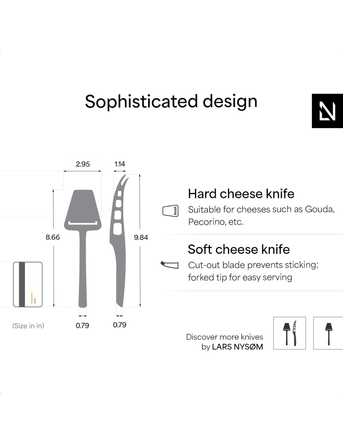 ¿De qué material están hechos el cuchillo y el cortador de queso? El cuchillo de queso LARS NYSM está fabricado con 100% acero inoxidable resistente y duradero. ¿Se pueden limpiar los cuchillos de queso en el lavavajillas? Limpiar cuchillos afilados en el lavavajillas provoca corrosión y desafila la hoja más rápidamente. Por lo tanto, recomendamos limpiar todos los cuchillos de queso LARS NYSM a mano. ¿Para qué tipos de queso está diseñado el juego? El juego de cuchillo y cortador de queso "Nydelse" está diseñado para quesos duros como Gouda, Pecorino, etc. ¿Qué incluye el paquete? El juego "Nydelse" consiste en un cuchillo para queso blando y un cortador de queso duro. Se entrega en un embalaje de regalo sin plástico con un cierre magnético. Un regalo perfecto para ocasiones especiales como cumpleaños o Navidad.