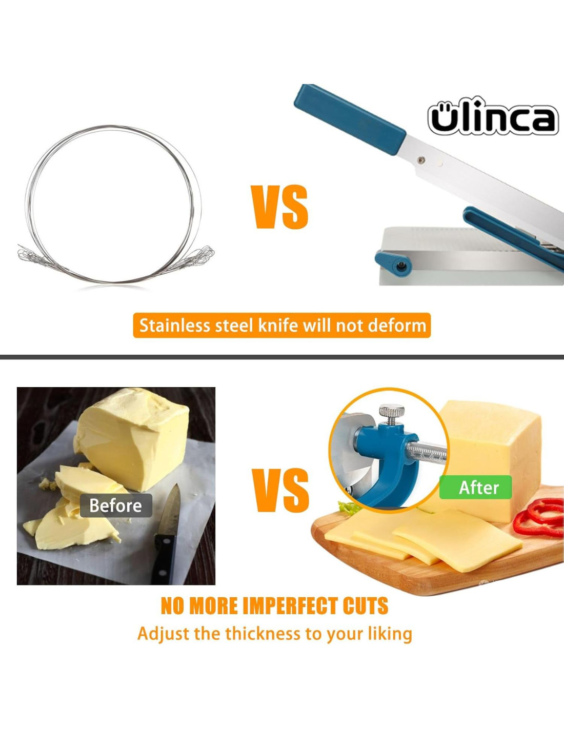 - [Cuchilla de Corte de Acero Inoxidable Resistente] No necesitas preocuparte por la deformación de la herramienta de corte y no necesitas reemplazar la cuchilla. La cuchilla afilada puede cortar fácilmente no solo quesos semiduros y duros, sino también otros alimentos como salchichas, jerky, pepino y más.