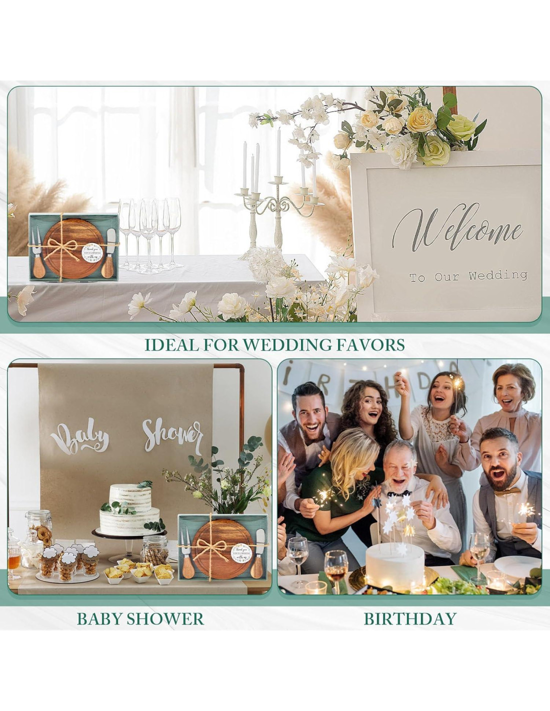 - Diseño elegante: la tabla de queso redonda adopta el color clásico, que puede combinarse armoniosamente con las cajas de regalo, etiquetas de regalo, cuchillos para mantequilla y tenedores, práctica y ornamental; las etiquetas de agradecimiento están impresas con las palabras 'gracias por celebrar con nosotros', expresando tu aprecio a tus invitados