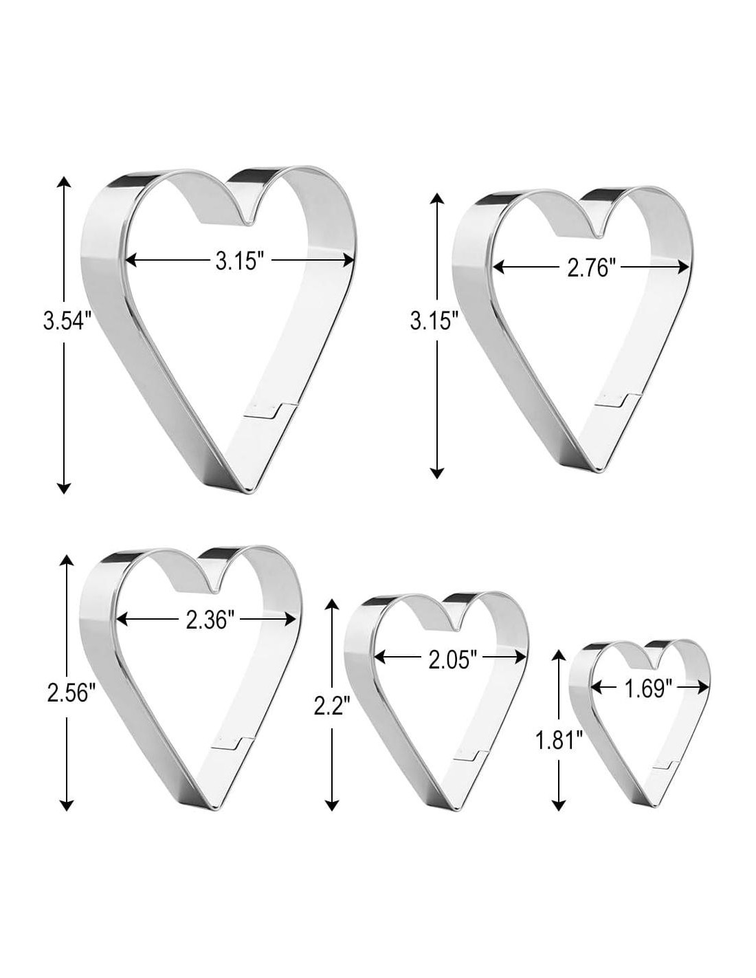- Diferentes Tamaños y Profundidades: 5 moldes para cortadores de sándwich en forma de corazón color rosa tamaños - 3.82 pulgadas, 2.6 pulgadas, 2.05 pulgadas, 1.5 pulgadas, 1 pulgada, altura es 1.5 pulgadas (3.8 cm). 5 cortadores de galletas en forma de corazón color plateado mini tamaños - 3.15 pulgadas, 2.76 pulgadas, 2.36 pulgadas, 2.05 pulgadas, 1.69 pulgadas, altura es 0.78 pulgadas (2 cm).