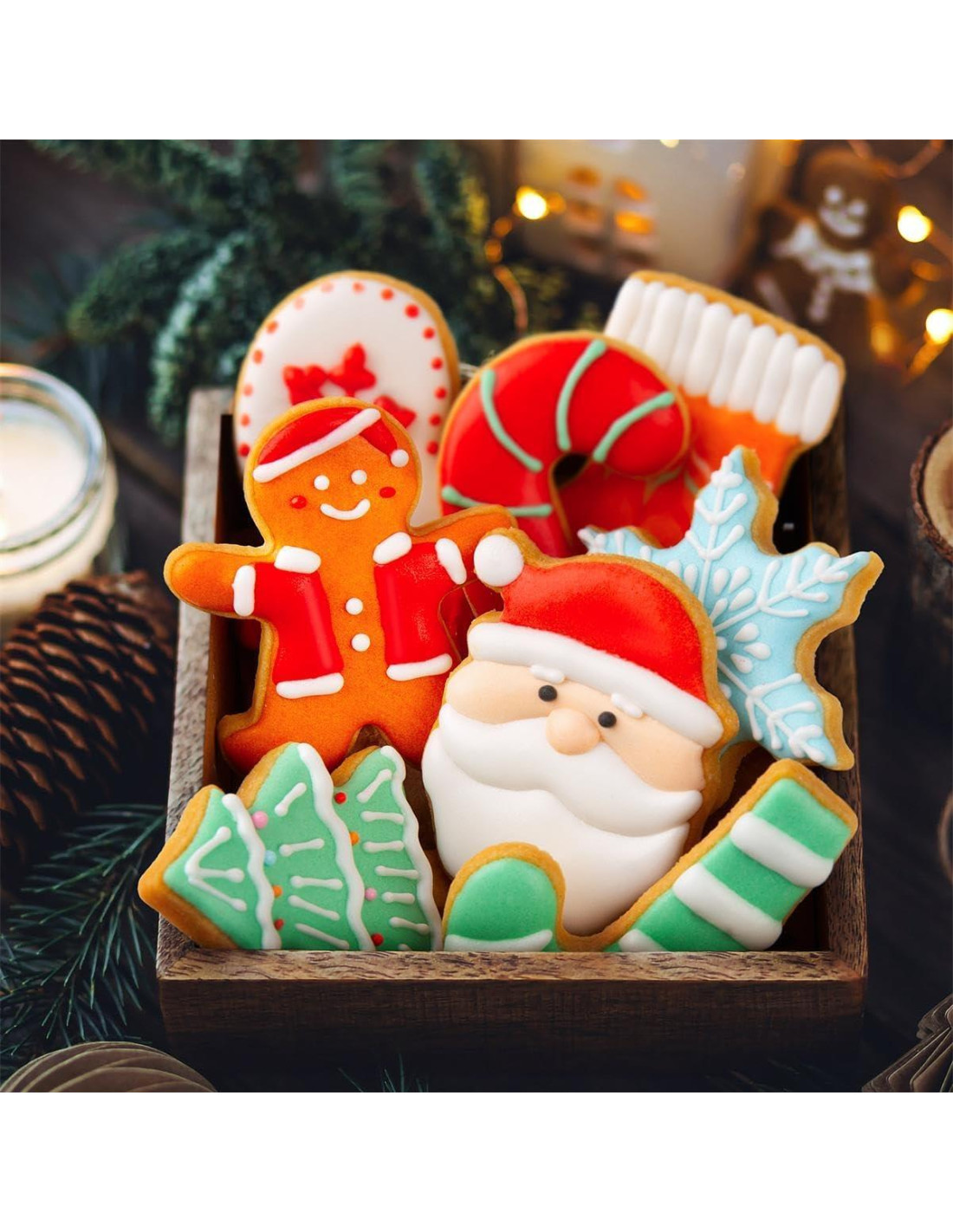 - El juego de cortadores de galletas de Navidad está temáticamente basado en la Navidad y cuenta con 12 formas diferentes de cortadores de galletas, incluyendo hombre de jengibre, mujer de jengibre, árbol de Navidad, copo de nieve, cara de Santa, cabeza de reno, bastón de caramelo y más formas de cortadores de galletas.