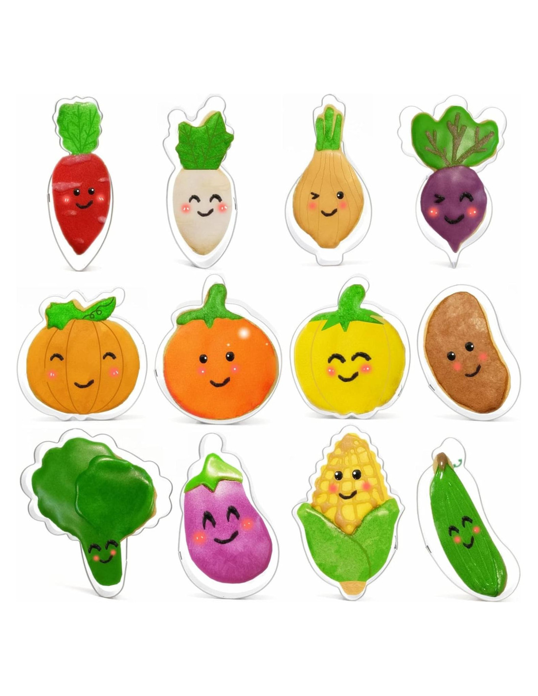 - 12 PZS DE MOLDES PARA CORTAR GALLETAS EN FORMA DE VERDURA: Juego de moldes DIY de acero inoxidable, 12 moldes de corte de galletas de diferentes tamaños de la serie de verduras: zanahoria, tomate, cebolla, pimiento, calabaza, papa, rábano blanco, pepino, coliflor, rábano, berenjena, maíz. Diversas formas de moldes para galletas para que puedas hacer diferentes galletas.