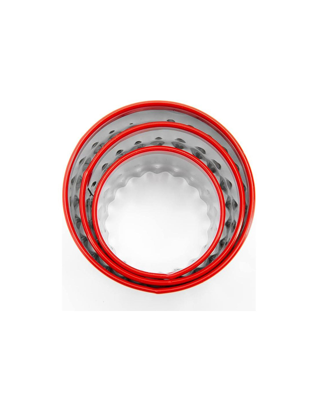 - Juego de Cortadores de Galletas Redondos de 3 Piezas con Olas - 2" (5.08 cm) 2.6" (6.60 cm) 3" (7.62 cm), y todos tienen 2 pulgadas (5.08 cm) de altura.