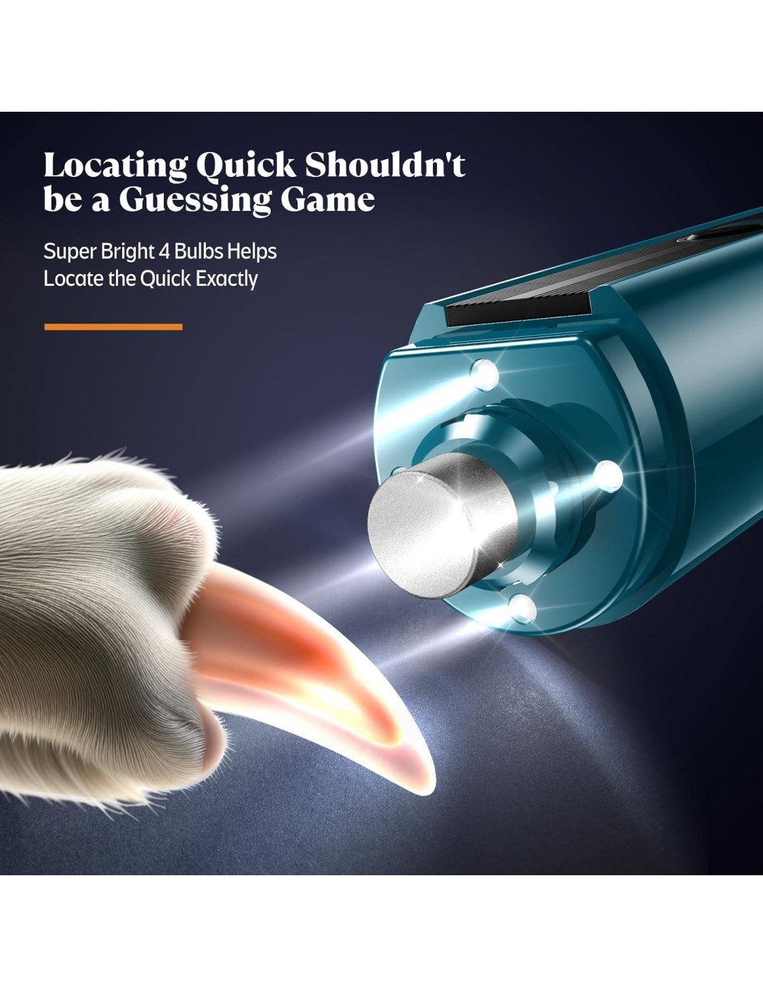 - Las 4 luces en todas las direcciones aseguran que puedas ver la parte rápida y los detalles de la uña, haciendo que el proceso sea sin estrés tanto para ti como para tus amigos peludos, incluso durante las sesiones de cuidado de uñas por la noche.