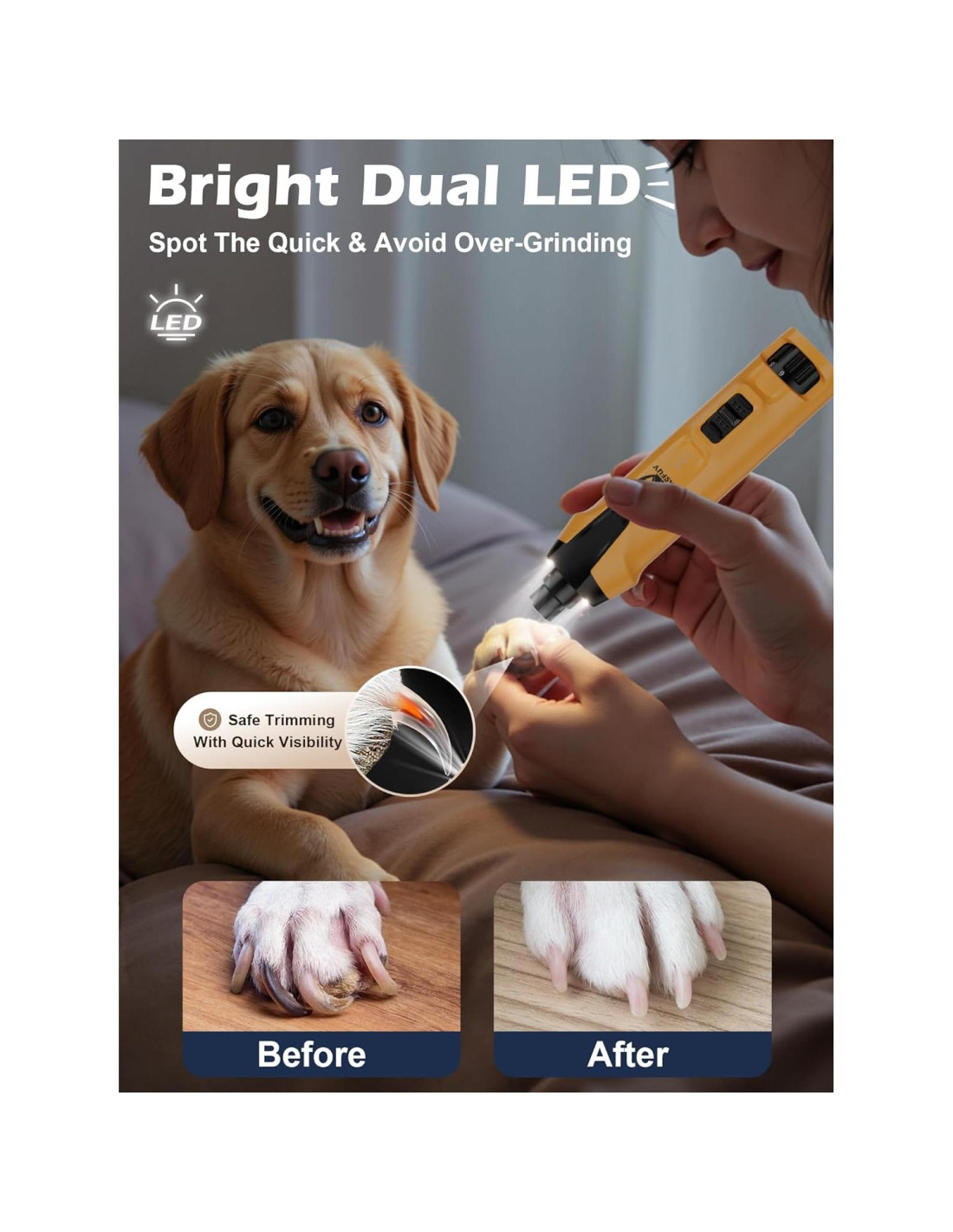 - [Doble LED Brillante para Molienda Segura y Precisa] Dos luces LED integradas iluminan claramente el área de las uñas, nuestro cortauñas eléctrico para perros te ayuda a detectar fácilmente la parte rápida y evitar la sobre-molienda, y ofrecen visibilidad mejorada desde múltiples ángulos, incluso para uñas oscuras y gruesas o condiciones de poca luz.