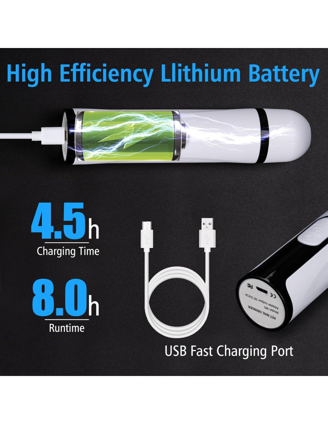 - Batería de Litio de 2000mAh, Pantalla LED: Equipado con una batería de litio de 2000mAh, carga por USB, proporciona hasta 8 horas de tiempo de trabajo, lo que es un 40% más de tiempo de funcionamiento que los cortauñas ordinarios. A diferencia de los cortauñas tradicionales, nuestros cortauñas están diseñados con una pantalla digital, lo que te permite monitorear fácilmente el nivel de velocidad y la duración de la batería.