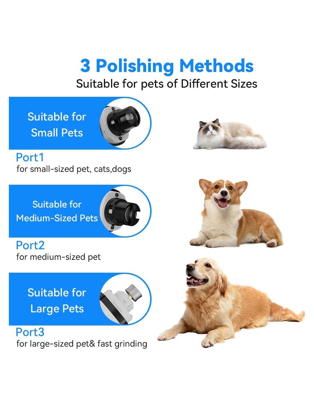 - El cuidado es más seguro: Cuenta con 2 puertos de pulido y configuraciones de doble velocidad para un recorte preciso y protegido en todos los tamaños de mascotas. Asegura resultados suaves y sin astillas