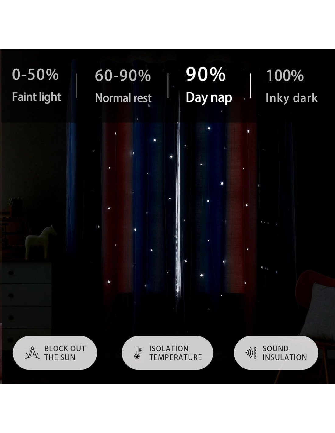 - DISEÑO ÚNICO: Nuestras cortinas presentan un diseño de doble capa, con la capa interior mostrando cortinas opacas impresas y la capa exterior adornada con tul. Utilizando tecnología láser de vanguardia, cortamos intrincadamente estrellas en la cortina interior. Cuando la luz del sol filtra a través, crea un efecto de cielo estrellado hipnotizante, perfecto para despertar la imaginación y la maravilla.