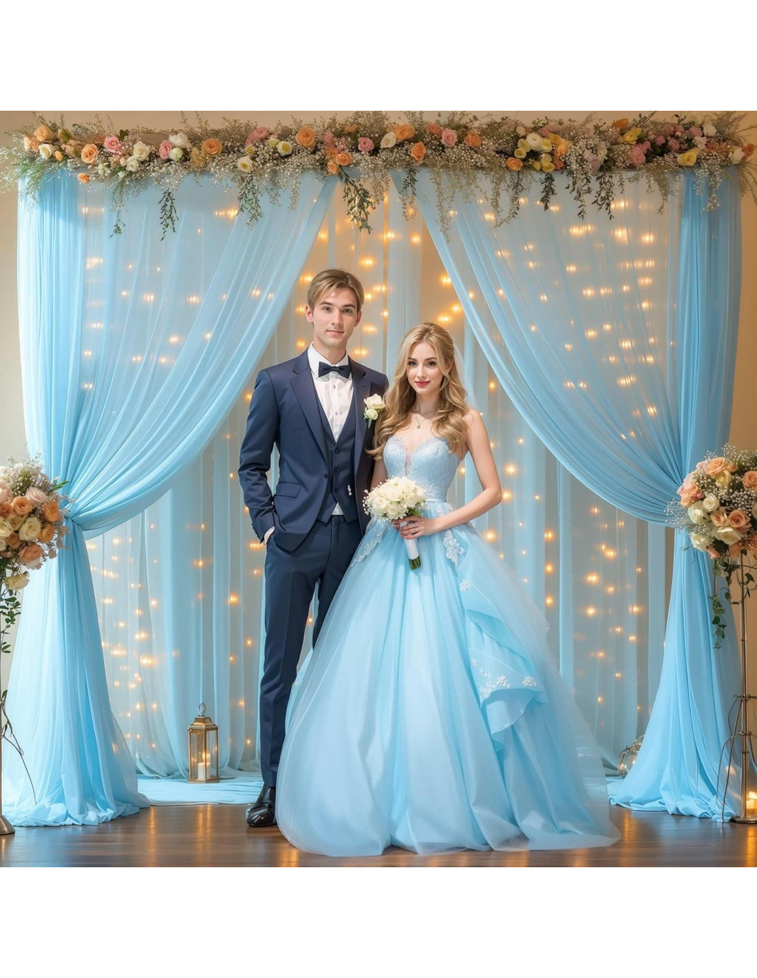 - Fondo con Luces Incluye - El paquete incluye 2 paneles de cortinas de fondo de tulle azul, cada cortina transparente tiene 5 pies (1.52 metros) de ancho y 10 pies (3.05 metros) de alto. También incluye un juego de luces de cuerda cálidas de 9.8 pies (3 metros) (10 hilos) (alimentado por USB, sin control remoto) y 12 clips transparentes.