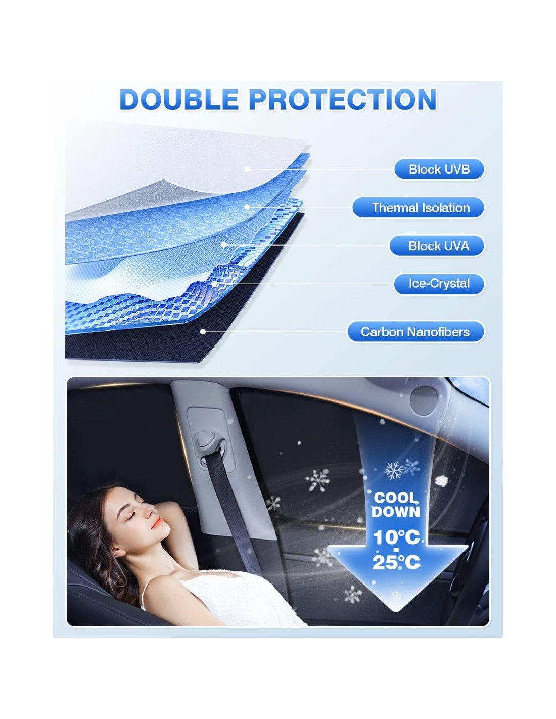 - [Protección Total] 1*protector solar para parabrisas, 1*protector solar para ventana trasera, 4*bloqueadores solares laterales, 2*cubiertas solares triangulares ofrecen 100% de protección contra los rayos UV. El deflector solar también hace un buen trabajo protegiendo a bebés y niños de la luz solar, y reduciendo la temperatura interior del auto. ¡Grandes accesorios para su auto!