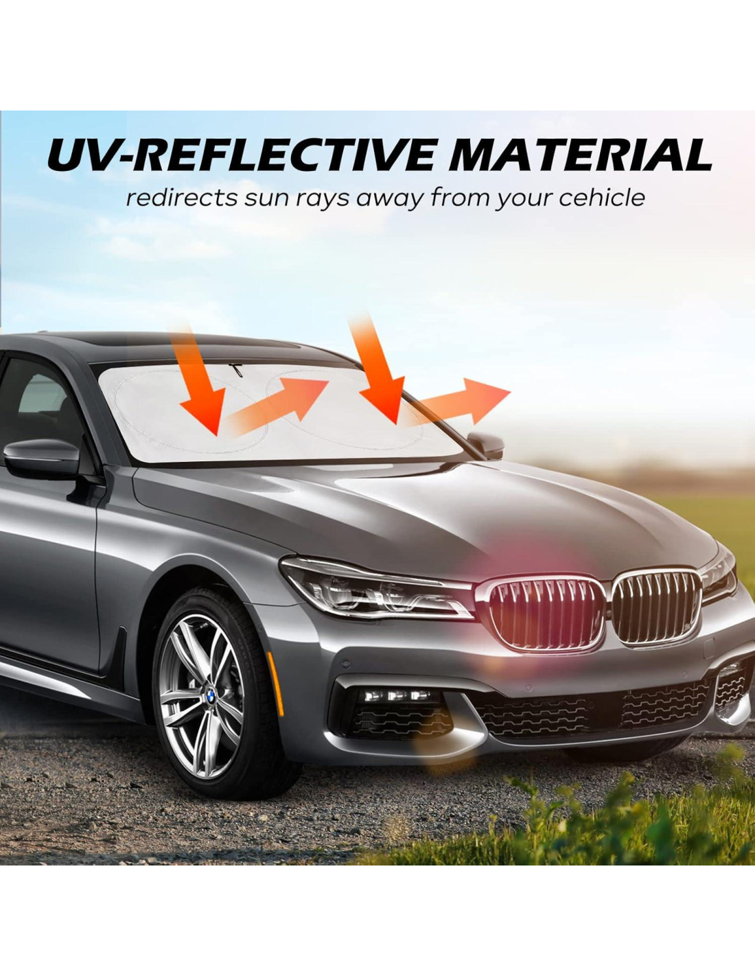 El protector solar para parabrisas mantiene su coche fresco, le proporciona una temperatura interior cómoda y evita el peligro causado por una temperatura interior excesiva. Solo apoye el protector solar contra la ventana frontal del coche y luego sosténgalo con el protector solar, lo que puede prevenir eficazmente que los dañinos rayos ultravioleta dañen el asiento de su coche, el panel de instrumentos y otros equipos.
