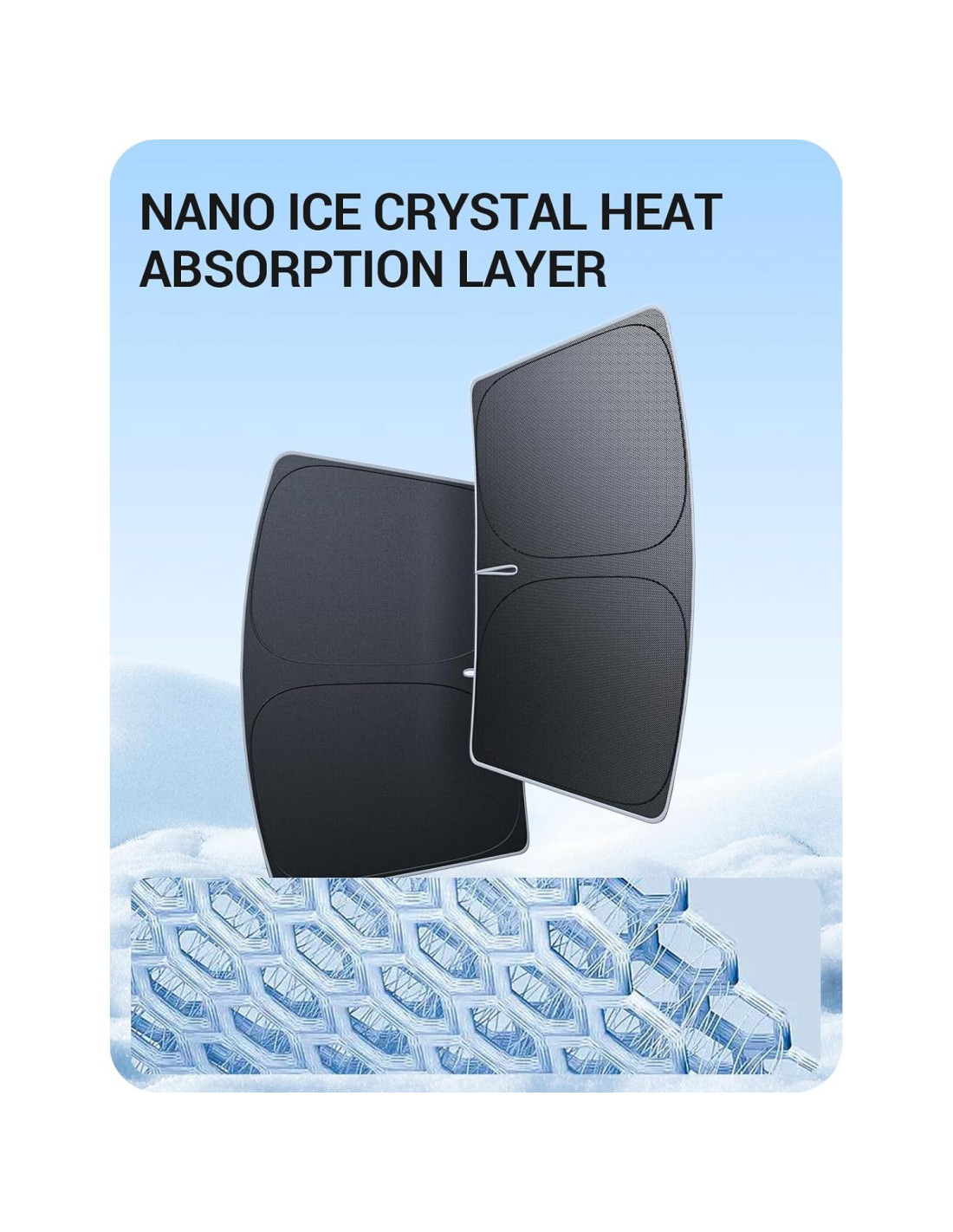 - Bloquea el 100% de los Rayos UV - La Defensa Solar Definitiva: Nuestro protector solar cuenta con una innovadora tecnología de enfriamiento de cristal de hielo, con más de 500,000 partículas de cristal de hielo incrustadas en la tela. Bloquea el 100% de la luz solar, asegurando que tu tablero, asientos de cuero y más estén protegidos del daño UV mientras mantiene el interior de tu automóvil refrescantemente fresco a una temperatura perfecta de 32C.