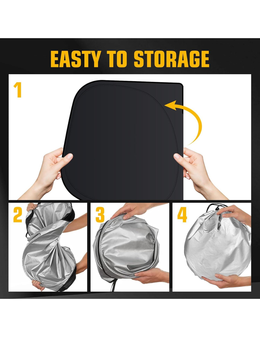 - [Fácil de Instalar y Plegable para Almacenar] Todo lo que necesitas hacer es colocar el protector solar sobre todo el parabrisas, bajar la visera y presionar hacia abajo, luego ajustar el Velcro en el protector solar. Es un trabajo fácil. El escudo del parabrisas tiene una línea de memoria elástica, que puede doblarse y plegarse en la bolsa de almacenamiento, no ocupa espacio y no se deformará al usarse nuevamente. Puedes guardar fácilmente el protector solar del parabrisas en el bolsillo de la puerta
