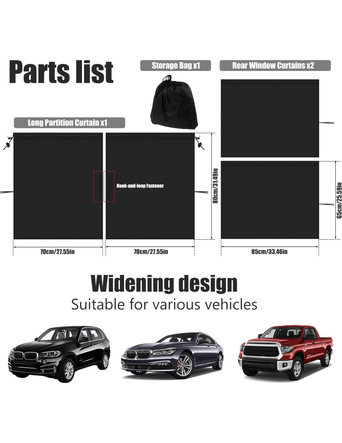 - [Ajuste Universal] Nuestros productos están disponibles en 2 especificaciones diferentes: 1 cortina divisoria larga para el asiento trasero o 1 cortina de partición larga para el asiento trasero más 2 cortinas laterales para las ventanas del asiento trasero, puedes elegir según tus necesidades. La cortina de partición larga mide 140 x 80 cm (55.1 x 31.5 pulgadas), y el tamaño de las dos cortinas traseras es 65 x 85 cm (25.6 x 33.5 pulgadas), han sido ampliadas, lo que es más grande que las cortinas ordinarias en el mercado, y pueden adaptarse a varios automóviles, SUV, camionetas y otros modelos.
