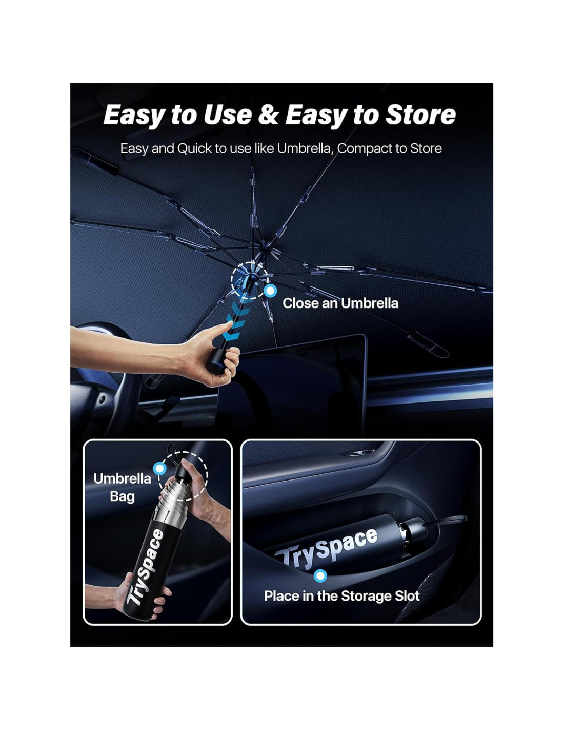 - [Fácil de Usar y Almacenar] La Sombrilla TrySpace, similar a un paraguas, ofrece instalación y almacenamiento sin esfuerzo. Diseñada para la conveniencia, se pliega en segundos, encajando perfectamente en nuestro exclusivo soporte para un fácil almacenamiento en el espacio bajo el asiento de tu coche o en el bolsillo de la puerta. Su diseño fácil de usar asegura una protección solar sin complicaciones.