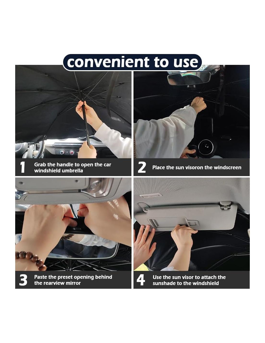 - Fácil de Usar: Nuestra sombra para parabrisas de coche no requiere herramientas de instalación adicionales, el método de uso es el mismo que el de nuestros paraguas de uso diario, solo necesitas agarrar el mango después de estacionar y abrir lentamente la sombra para cubrir el parabrisas delantero. Se puede usar con un parasol de coche, presiona y asegura el paraguas sombra del coche.