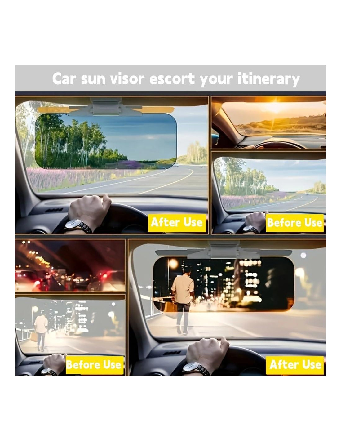 - Antideslumbrante: Esta visera de sol para automóvil protege efectivamente tus ojos de luces deslumbrantes o parpadeantes, tanto de día como de noche, al bloquear el deslumbramiento del sol durante el día y dispersar la luz fuerte por la noche. Es una herramienta esencial para cualquiera que quiera conducir de manera segura y confiada.