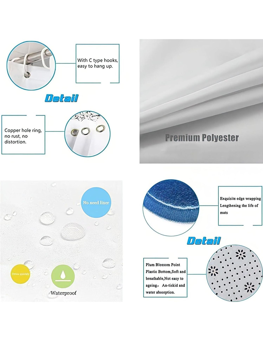 Estamos comprometidos a diseñar conjuntos de cortinas de ducha únicos y hermosos para traer más frescura a la vida de nuestros clientes. Hay varios tipos de conjuntos de cortinas de ducha para baño. Estamos comprometidos a diseñar conjuntos de cortinas de ducha únicos y hermosos para traer más frescura a la vida de nuestros clientes. Diseñado con un patrón especial de citas inspiradoras, adopta tecnología avanzada de impresión de patrones en HD, sin desvanecimiento. Haz que tu baño o inodoro sea más elegante y tenga un nuevo aspecto y te da más energía. Promueve la formación de gotas de agua y las gotas de agua caen como perlas, manteniendo la mayor parte del agua dentro, dejando tu baño fresco y de uso prolongado. La superficie superior utiliza material de franela de alta calidad, que es suave. La capa intermedia absorbe agua. La superficie inferior es antideslizante para tu seguridad. Hecho de tela de poliéster duradera. La alfombra de baño antideslizante / alfombra en forma de U está hecha de esponja de alta calidad, franela y fondo antideslizante, de secado rápido. 1pc x Cortina de Ducha, 1pc x Alfombra de Baño, 1pc x Funda de Tapa de Inodoro, 1pc x Alfombra en Forma de U, 12pcs x Ganchos de Plástico en Forma de C.