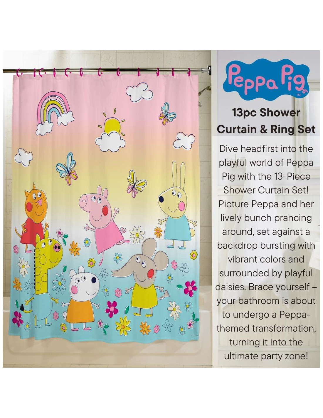 - DISEÑO DE PEPPA PIG: ¡Sumérgete de cabeza en el mundo juguetón de Peppa Pig con el Juego de Cortina de Ducha de 13 Piezas! Imagina a Peppa y su animado grupo saltando alrededor, contra un fondo lleno de colores vibrantes y rodeados de alegres margaritas. Prepárate: ¡tu baño está a punto de sufrir una transformación temática de Peppa, convirtiéndolo en la zona de fiesta definitiva!