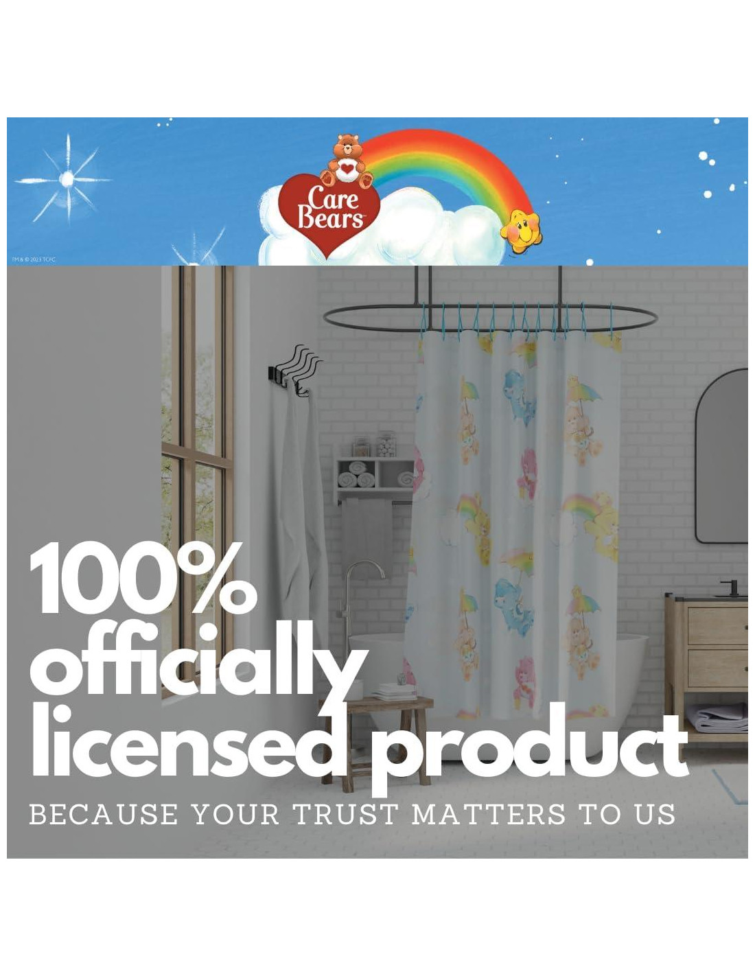 - DISEÑO DE CARE BEARS: Añade un toque de alegría a tu baño con nuestra Cortina de Ducha de los Care Bears. Presentando a los queridos Care Bears flotando con paraguas coloridos, arcoíris y nubes, este diseño aporta una explosión de positividad y capricho, transformando tu baño en un refugio alegre.