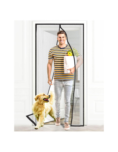 Pantalla de Puerta con Cierre Magnético - la Manera Más Fácil de Entrar y Salir de Su Hogar. Diseño único con tiras de bucle anchas a ambos lados y en la parte superior. Se ajusta a múltiples tamaños de puertas, la tira ancha se puede cortar o dejar como está. Aire fresco, luz solar. Envuelta con cinta gruesa en cuatro lados, más resistente y no fácil de romper. Hilo más grueso y longitud de puntada más cercana. Diseño especial de gancho y lazo y imanes extra reforzados en la parte inferior. Malla de fibra de vidrio duradera y fuerte. Fácil acceso para mascotas, amigable para niños. Tamaño de la Puerta de Pantalla Magnética: 38 x 83 pulgadas (96,52 cm x 210,82 cm). Adecuada para Puertas de Tamaño Normal: puertas de entrada, puertas de balcón, puertas francesas, puertas de patio, puertas corredizas, puertas de cocina, etc. Amplia Gama de Aplicaciones: pasillo, cocina, dormitorio, balcón, oficina, tiendas, instalación fácil sin herramientas. La pantalla de puerta de fibra de vidrio auto-sellante con imán es fácil de atravesar incluso cuando lleva cosas en las manos. La malla de pantalla puede cerrarse instantáneamente después de pasar, lo que es muy conveniente de usar.